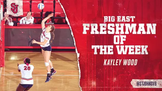 Wood, a freshman from Woodlands, Texas, earns her first BIG EAST Freshman of the Week honor after averaging 2.33 kills per set and five service aces in the two sweeps last weekend. The 6-2 right side hitter/middle blocker filled up the stat sheet in the win over the Wildcats with 10 kills, four digs, three blocks, three service aces and hit at a .348 clip to lift the Red Storm to its third-straight victory. A poised player beyond her years, Wood tallied six kills in the third set, including the final three kills of the match for the Johnnies.