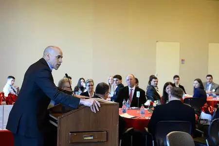 St. John's student-athletes, members of the band, cheer and dance groups, coaches, administrators and potential employers filled the D'Angelo Center Ballroom on Monday night, taking part in the department's annual Student-Athlete Career Connections. The event, co-founded by Athletic Director Emeritus Jack Kaiser, was highlighted by a keynote address from John Bender '87CBA, Chief Executive Officer of Allied World Reinsurance Company.